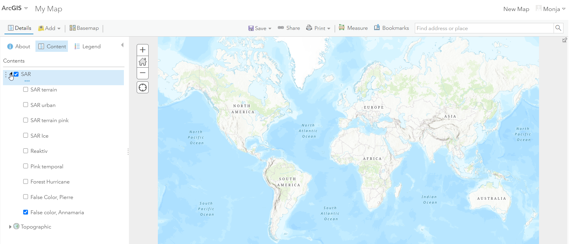 - Next, you will see the name of your configuration (in this case, SAR) in the Contents panel on the left. Click on the arrow next to it, to expand it and uncover the layers.