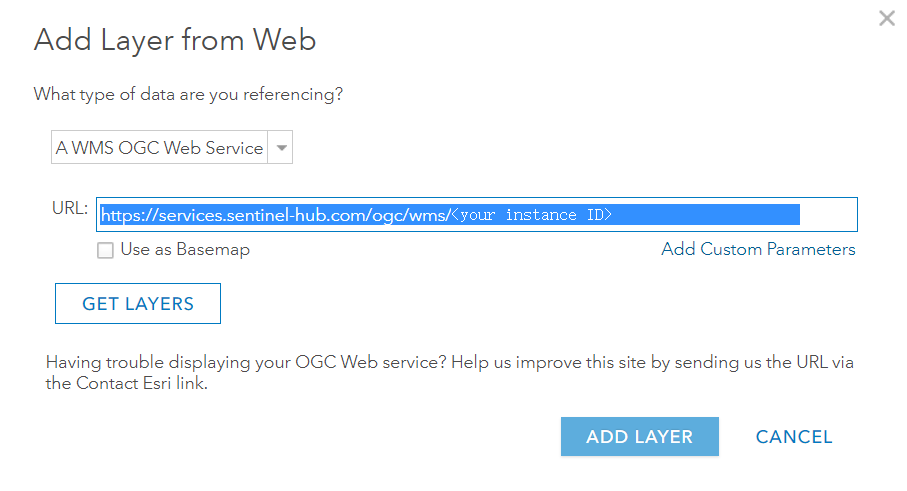 - Paste it into the URL window in ArcGIS Online dialog and click the GET LAYERS button.