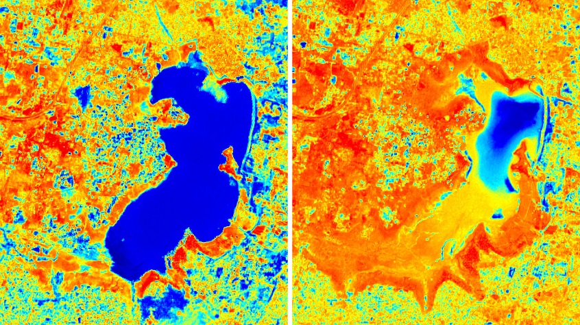 On the images below, Sentinel-2 moisture index was used to compare the area before (left) and during (right) the drought, showing the desiccation of the Red Hills Reservoir over the heat period in 2019 with a clearly retreating water line.