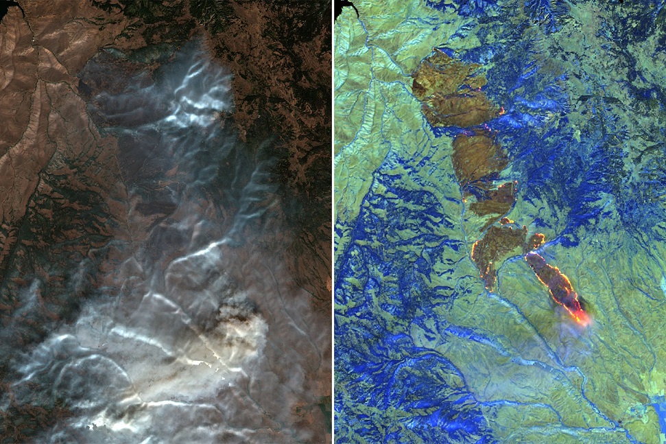 On the left image below, you can see the Oregon wildfire on September 9, 2020, in natural colors, emmiting thick smoke. On the right image, a custom composite using SWIR and NIR bands was used to penetrate the smoke and highlight the fires and the area burned.