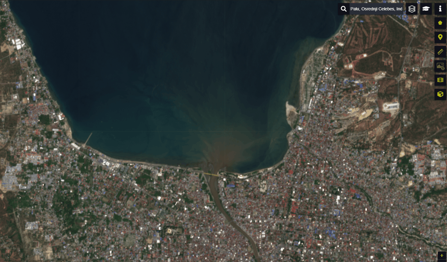 On 28 September 2018, the Indonesian island of Sulawesi was struck by a 7.5 magnitude earthquake. The epicentre was on the island’s northwest coast – 77 km north of Palu, which lies at the head of a long narrow bay. The quake triggered a tsunami that swept huge surges of water – as high as 10 m – along the bay and swamped the city. The combination of the earthquake, tsunami, soil liquefaction and landslides claimed well over 2000 lives, destroyed homes, buildings, infrastructure and farmland in several districts.