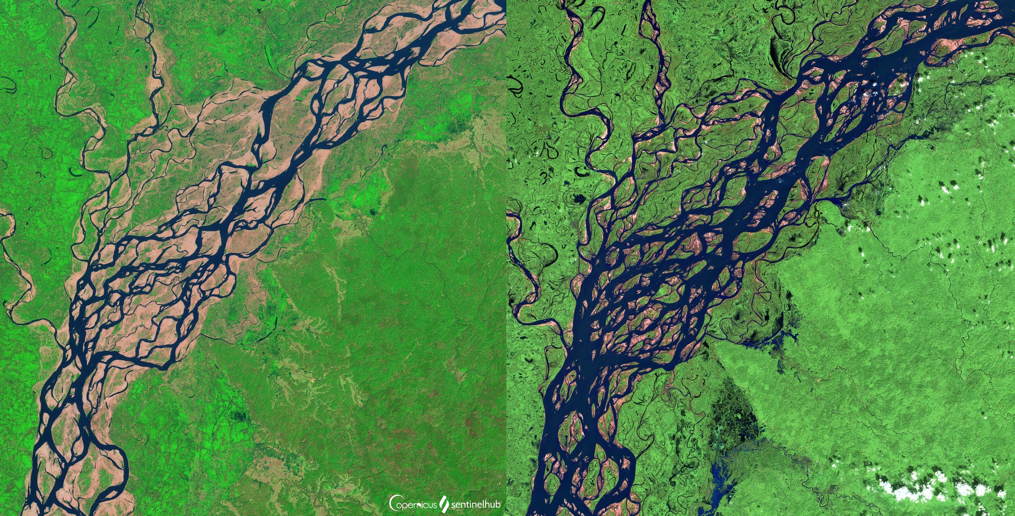 Below, we can observe the striking difference between the before (left) and after (right) Sentinel-2 images of Bangladesh flooding in 2017, using a SWIR visualization.
