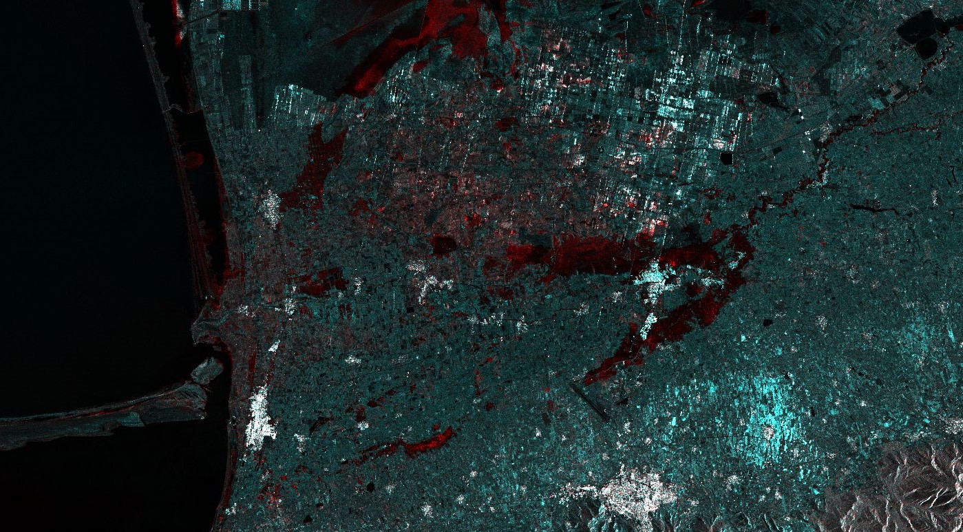 On the image below, multitemporal Sentinel-1 imagery was used to map the flood in Aghghala, Iran on March 23, 2019. A different date was used as a refference and input into the blue channel, while the image on the day of the flooding was input into the red channel. The difference between the two displays flooded areas in red color.