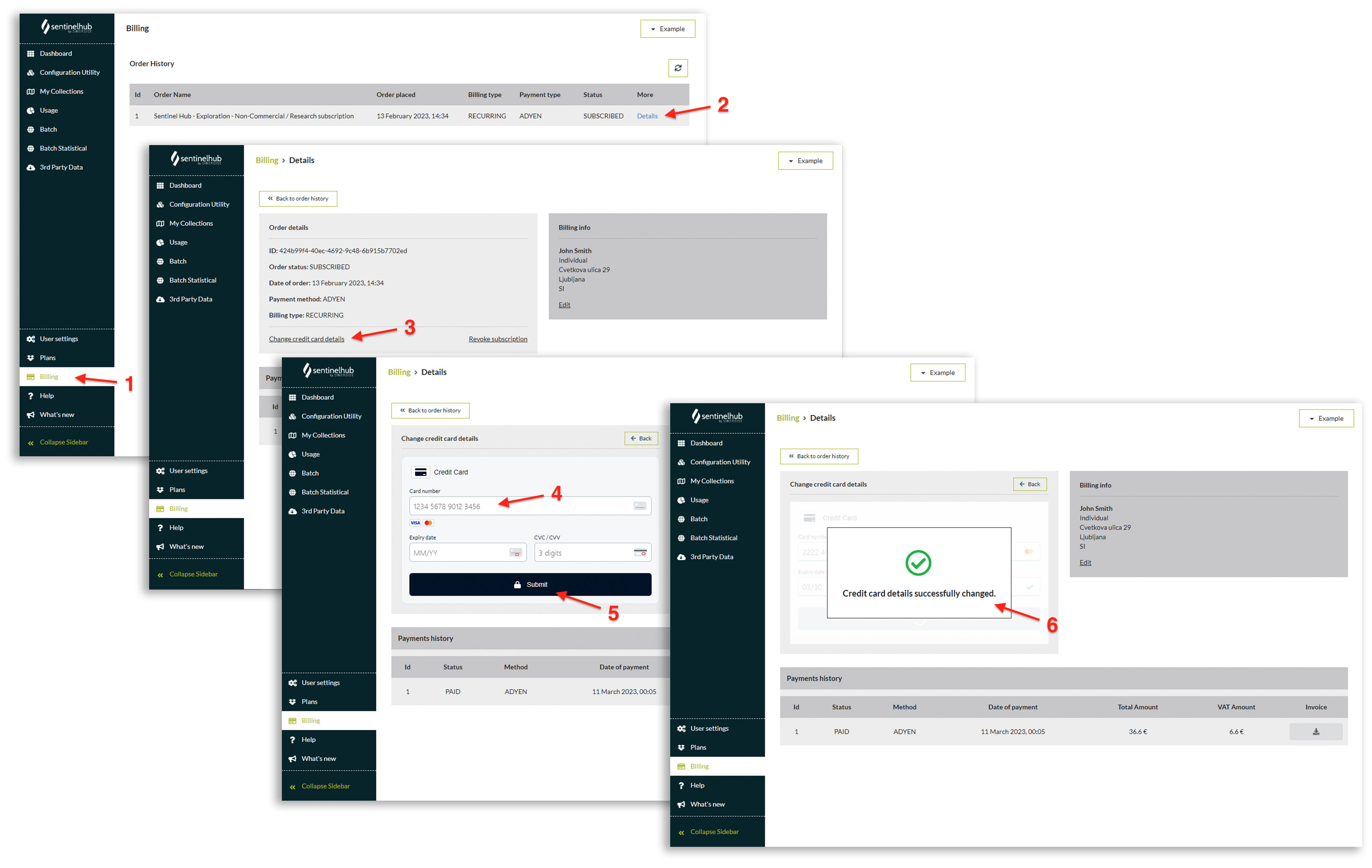 To change your credit card details, please log in to the Sentinel Hub Dashboard and follow these steps: