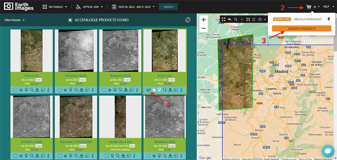 To upgrade your plan, select the “Upgrade” button under the desired plan (2). To downgrade your plan, select the “Downgrade” button under the desired plan (3). In both cases, follow the guided purchase process in the Sentinel Hub Dashboard.