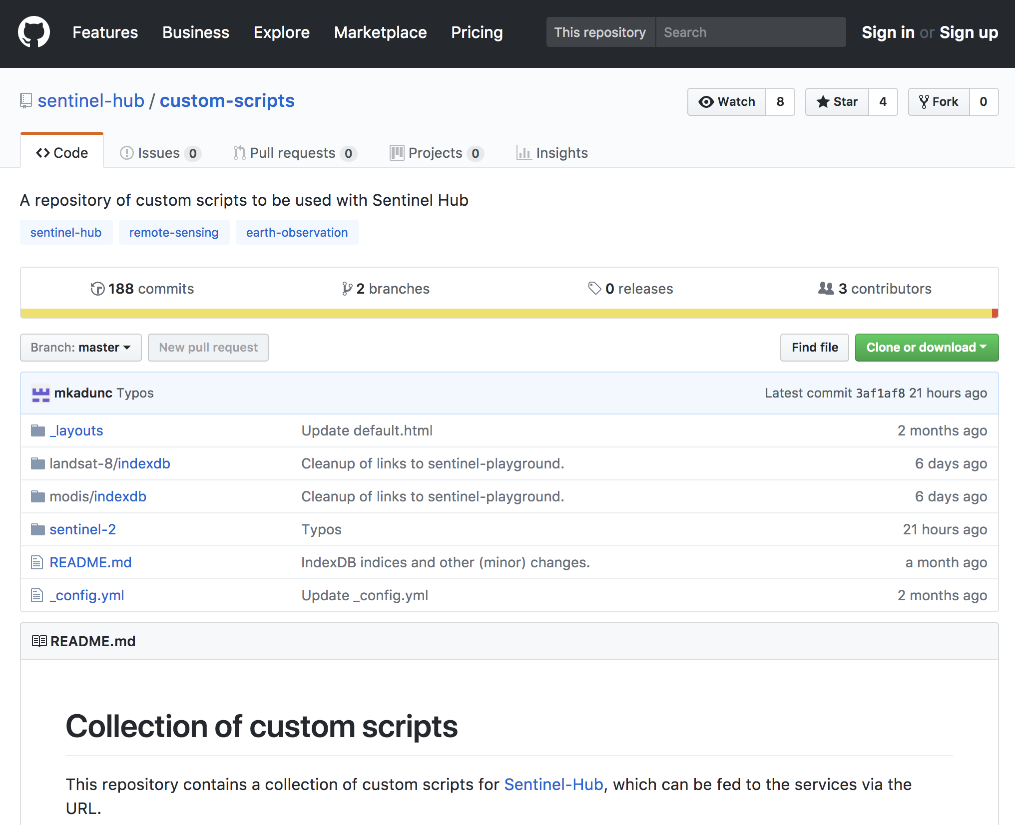 We have established custom scripts repository at Github, where you can find all of our EO products, along with some other popular processing methods. With this small contribution to the rapidly evolving remote sensing field we would like to open the doors to Earth observation to many.Since Github supports versioning, the scripts can evolve through time. We plan to add interesting scripts to the repository in the future, and we welcome you to contribute your knowledge as well. For more information, we invite you to an interesting read from our CEO, Grega Milčinski.
