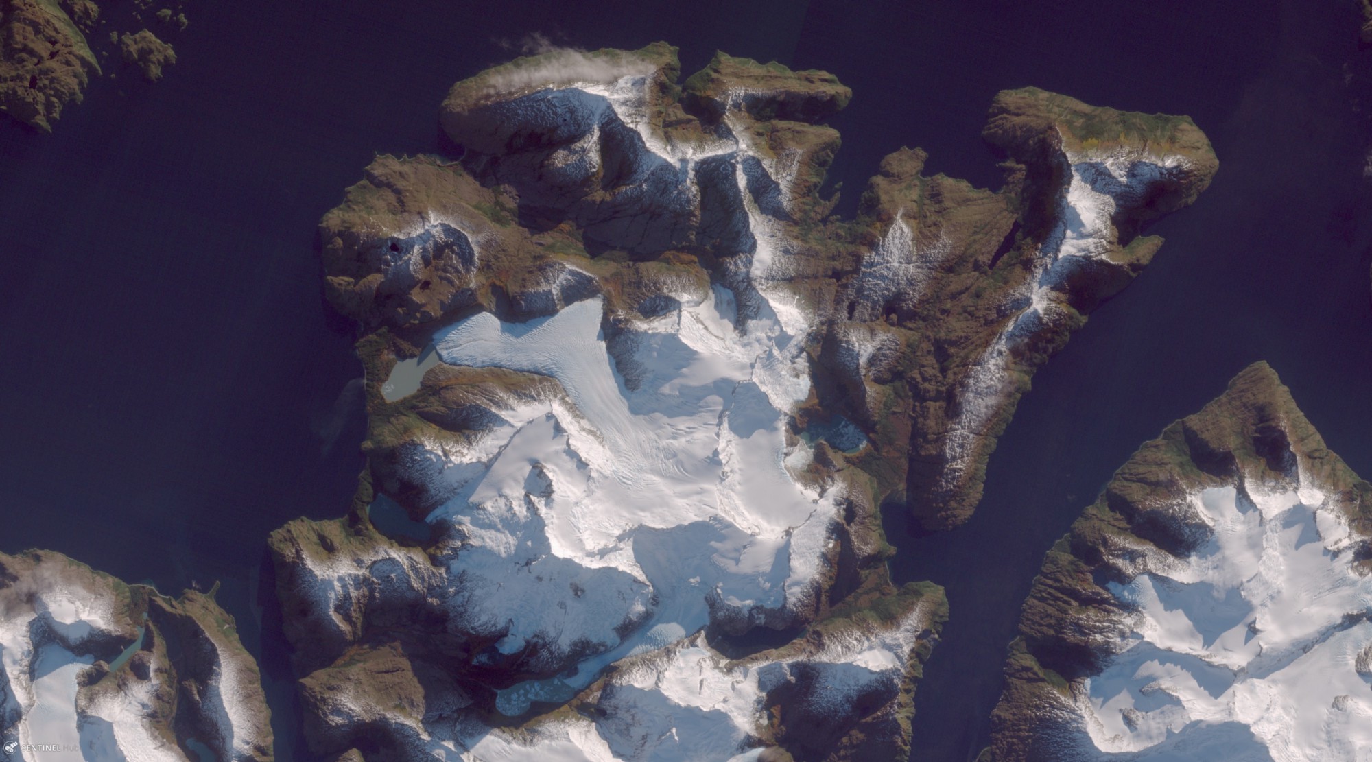 Final color corrected image of Monte Sarmiento, Sentinel-2A on 2016-05-05. Tweak the script and discover other gems on the Earth's surface with Sentinel Playground.